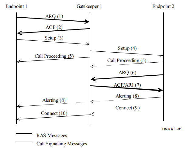 (2)接入控制:關守必須使用ARQ/ACF/ARJ H.225.0消息批準網絡接入。它依賴于呼叫授權、帶寬、以及其它某些由生產廠商規(guī)定的準則。它也可以是零功能,允許所有請求。