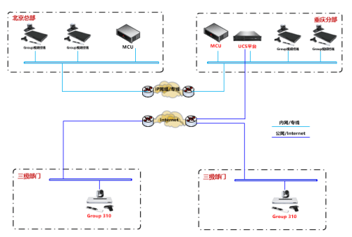 當(dāng)前重慶會(huì)議室部署有一臺(tái)視頻會(huì)議終端,重慶至北京之間部署有專線鏈路,可直接通過企業(yè)專線IP地址實(shí)現(xiàn)視頻會(huì)議呼叫。因下級(jí)分支機(jī)構(gòu)有通過互聯(lián)網(wǎng)接入視頻會(huì)議的需求,需對(duì)當(dāng)前的視頻會(huì)議系統(tǒng)進(jìn)行升級(jí)調(diào)整,以適應(yīng)新的應(yīng)用需求: