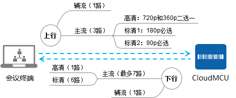 SVC會(huì)議終端可以是esapce客戶(hù)端和Web會(huì)議客戶(hù)端。終端上行到CloudMCU的主流支持3路高清/標(biāo)清視頻,CloudMCU下行到終端的主流最多支持1大6小共7路。輔流(演示)上下行均1路。
