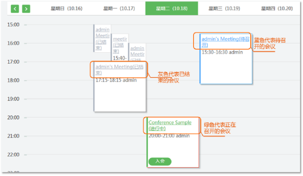 與會(huì)者登錄EMP后可以一目了然的看到自己預(yù)訂的會(huì)議和需要參加的會(huì)議信息,從而方便地安排自己的日程和時(shí)間。同時(shí)可以方便的通過(guò)時(shí)間軸會(huì)議信息欄上的入會(huì)按鈕加入會(huì)議。不同狀態(tài)的會(huì)議呈現(xiàn)不同的顏色,同時(shí)預(yù)訂人、召集人、普通與會(huì)者可以點(diǎn)擊會(huì)議主題,查看會(huì)議的詳細(xì)信息。會(huì)議信息欄顏色表示的會(huì)議狀態(tài)如圖所示。
