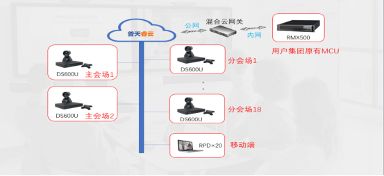 在一公司實現(xiàn)對下視頻會議的同時,還加入混合云網(wǎng)關(guān)的解決方案,將睿云的VMR和集團(tuán)總部MCU打通,使得任何連接到一公司VMR的終端都可以加入到都可以加入到集團(tuán)總部的會議中去。