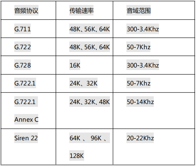 11、G.711/G.722/G.728/G.722.1/G.722.1 Annex C/Siren 22 音頻編碼協(xié)議的傳輸速率(Kbps)和音域范圍(KHz)分別是多少?答: