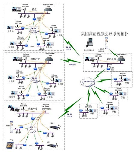 隨著我國改革開放的不斷深入,為加快信息交流速度,保證信息暢通,為滿足某集團(tuán)視頻會議應(yīng)用的需求,某集團(tuán)將基于SDH專線網(wǎng)絡(luò)及VPN ADSL專線,利用的通信傳輸技術(shù),組建統(tǒng)一的信息傳遞寬帶通道,連接從某集團(tuán)總部到零售業(yè)集團(tuán)分部、房地產(chǎn)集團(tuán)分部、藥業(yè)集團(tuán)分及學(xué)校部分的四大分部,各分部各自下轄相應(yīng)分支機(jī)構(gòu),其中零售分部為2M SDH專線網(wǎng)絡(luò),房地產(chǎn)分部為VPN ADSL專線網(wǎng)絡(luò),藥業(yè)集團(tuán)暫時(shí)不會建設(shè)系統(tǒng),后期建設(shè)可以以零售業(yè)分部作為建設(shè)模板參考。學(xué)校部分的會場目前網(wǎng)絡(luò)是直接接入某集團(tuán)總部,因此視頻會議系統(tǒng)中,學(xué)校部分會場全部直接接入總部,從而組成一套完整的視頻會議系統(tǒng),形成覆蓋整個(gè)企業(yè)集團(tuán)。