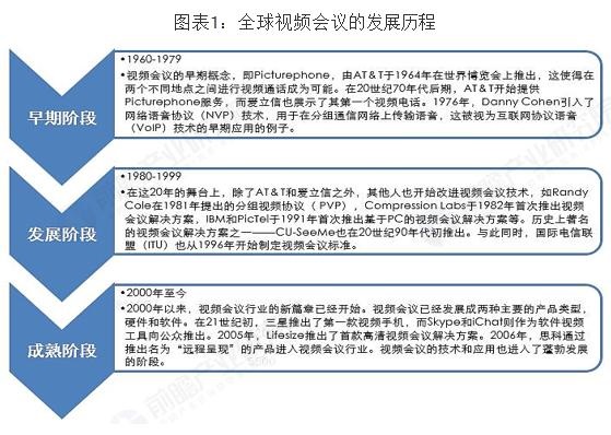 縱觀視頻會議系統(tǒng)行業(yè)的發(fā)展歷史,目前廠商始終處于領(lǐng)先地位。由于通信行業(yè)本身的技術(shù)性、組網(wǎng)架構(gòu)復(fù)雜性、互聯(lián)互通的可靠性穩(wěn)定性以及產(chǎn)業(yè)應(yīng)用的低成本需求,必然導(dǎo)致技術(shù)突破是核心驅(qū)動力。整體來看,視頻會議的發(fā)展大致可分為三個階段,即可分為早期階段、發(fā)展階段和成熟階段。