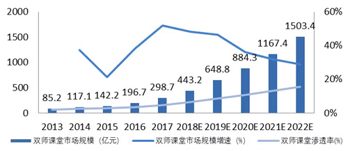 2017年,我國(guó)基礎(chǔ)教育雙師課堂市場(chǎng)規(guī)模達(dá)到298.7億元。在民營(yíng)教育機(jī)構(gòu)及政府大力推行雙師教育、教育資源共享的兩大利好背景下,未來(lái)幾年雙師課堂市場(chǎng)規(guī)模超千億。
